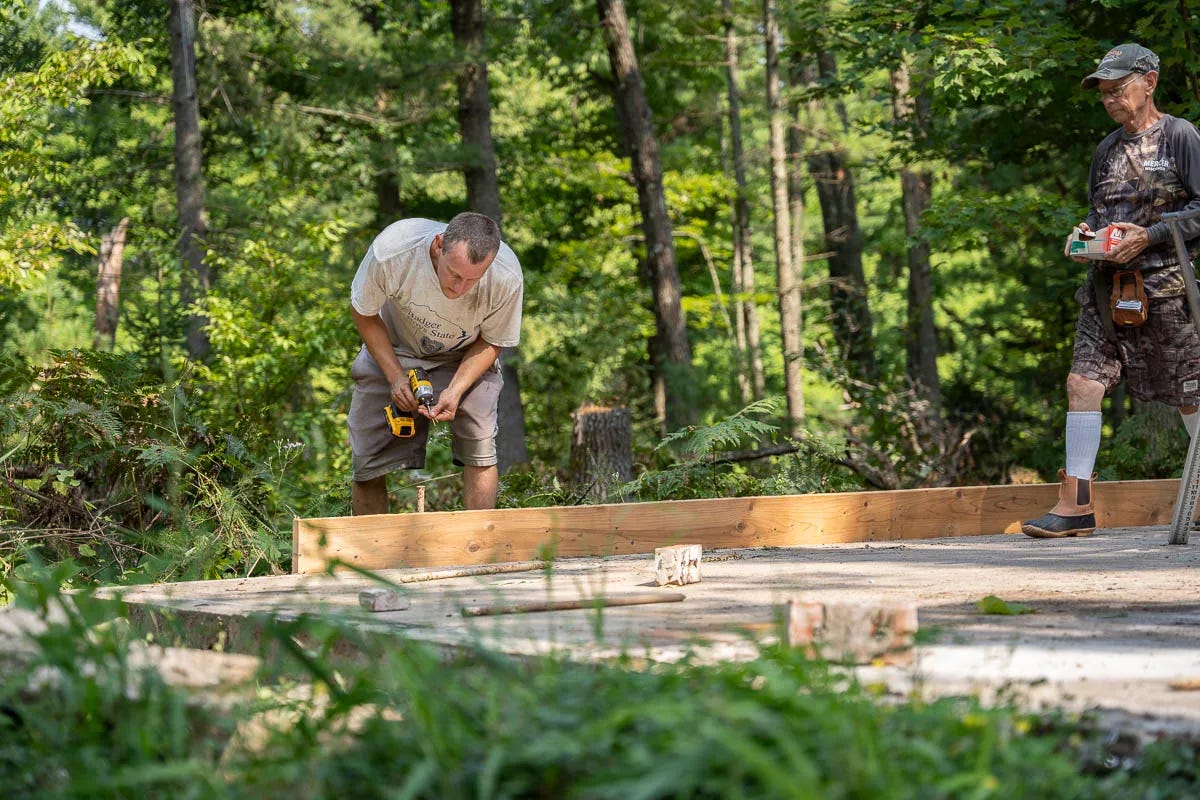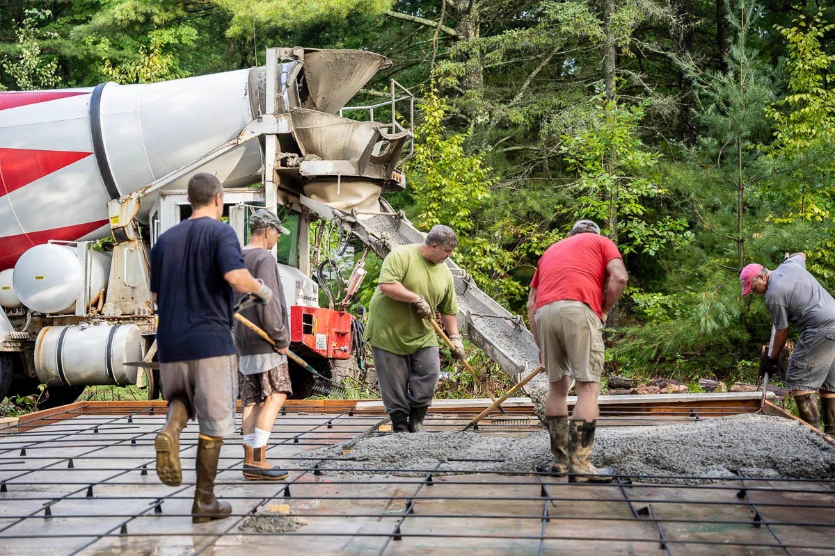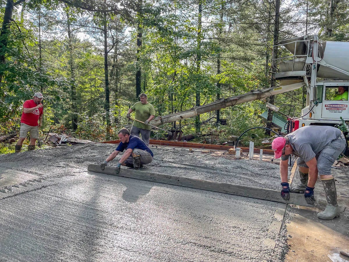 Finally, as summer turned to fall, we received the final okay to start building. Brett and Dave prepped the foundation and rallied a group of family and friends to help with the cement pour.