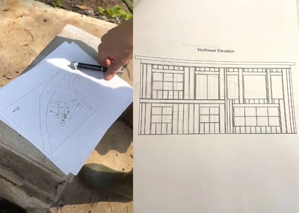 And that’s how we landed on building a skillion roof “cabin” with a loft, small attached garage, and the majority of windows facing east. Brett perfected the drawings and eventually sent them in with our zoning and building permit applications.